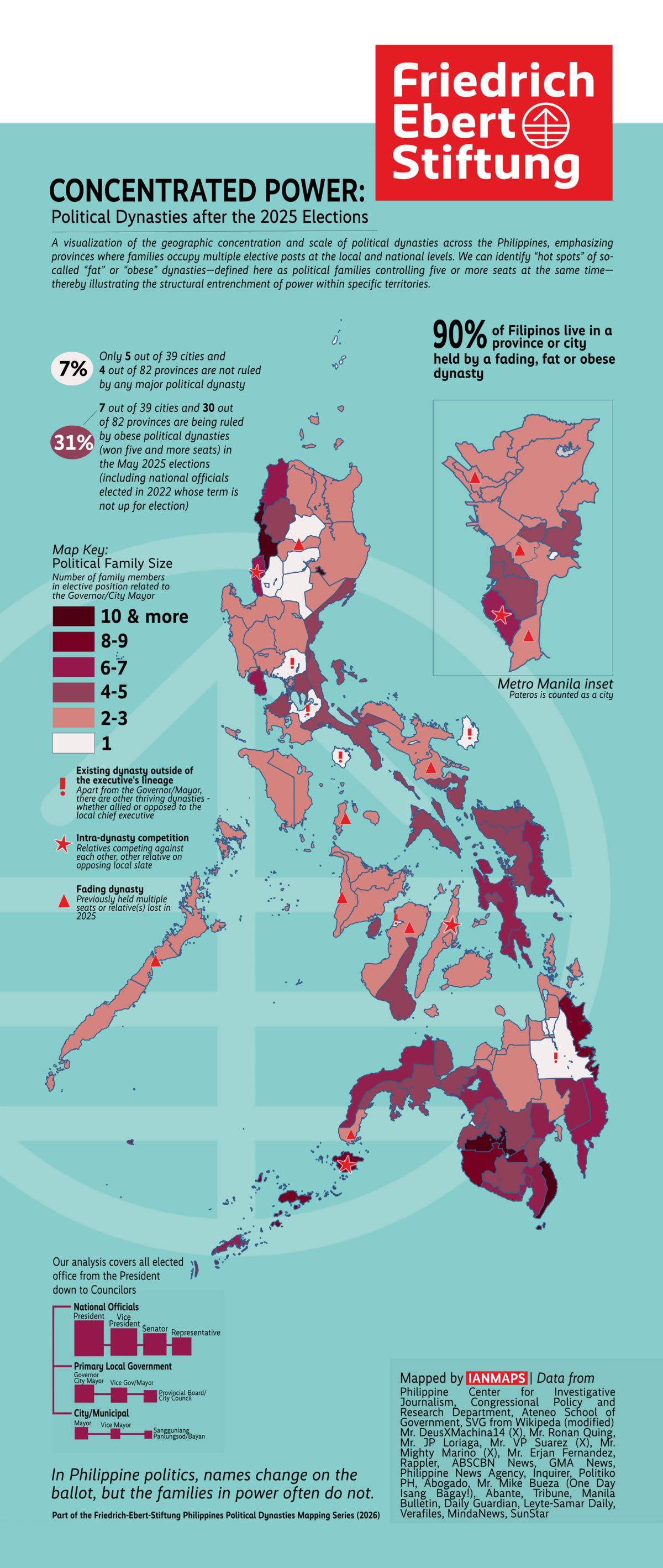 This mapping series analyzes the structural entrenchment of political dynasties in the Philippines by synthesizing publicly available electoral, demographic, and socioeconomic datasets. The objective is to examine how these power concentrations correlate with democratic competition, gender representation, and development outcomes. The maps use 2025 election data to classify dynastic concentration based on simultaneous office-holding. Political clan affiliations were identified using publicly available sources, including news reports, investigative articles, and documented public records.